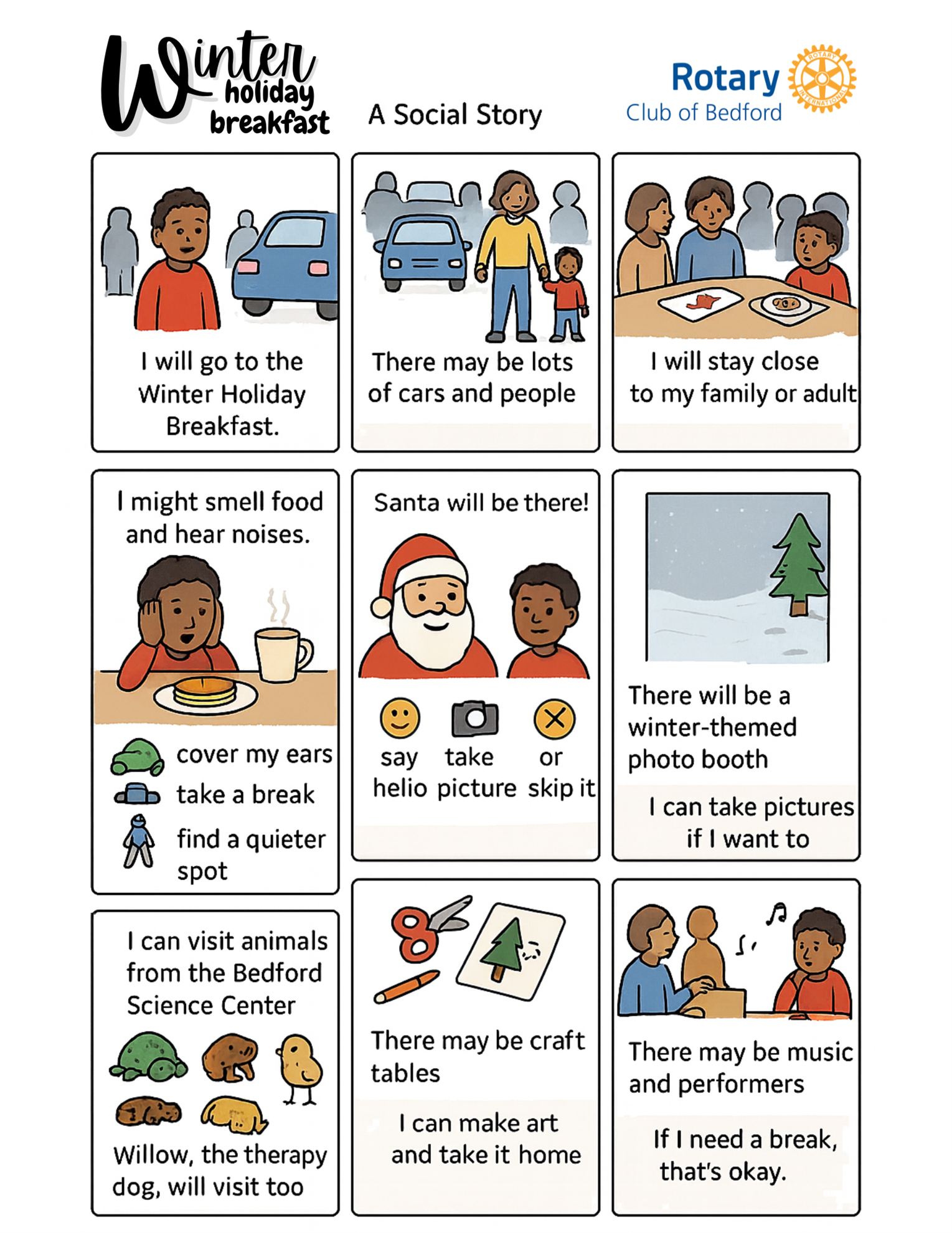 The Rotary Club of Bedford is pleased to share a new Visual Social Story designed to help children and families prepare for this year’s Winter Holiday Breakfast. We know that busy events, new environments, and lots of activity can sometimes feel overwhelming for young visitors. This resource provides a simple, supportive preview of what to expect.