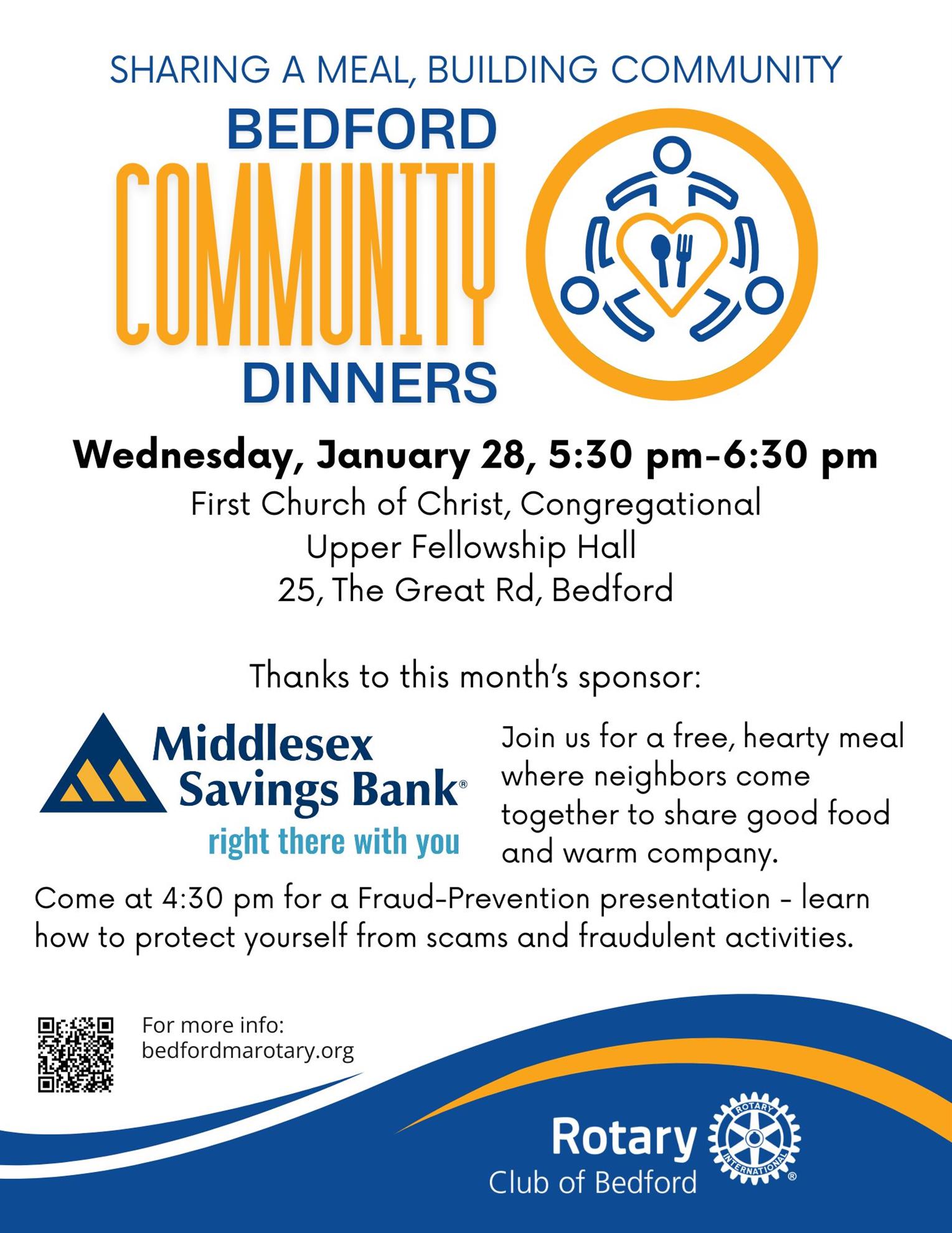 Come for the information, stay for the food, and enjoy an evening of connection and community. Everyone is welcome—we look forward to seeing you there! Seniors who require transportation should contact bedford.rotary@gmail.com, and we will do our best to accommodate you. Rotarians interested in offering rides should also contact bedford.rotary@gmail.com.
