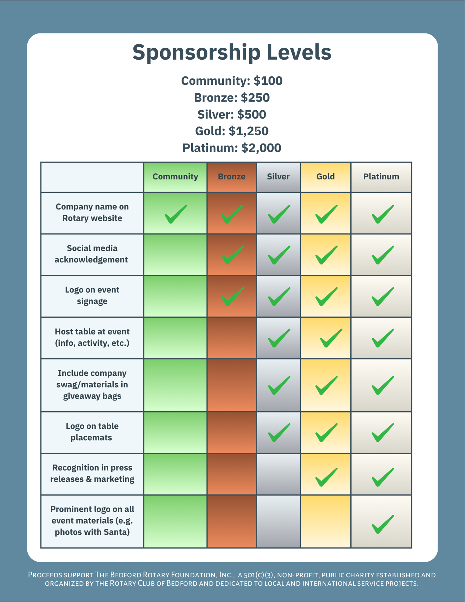 To make this community celebration a success, we’re inviting Rotary members, local businesses, and community partners to help sponsor the Winter Holiday Breakfast. Sponsorships play a crucial role in covering event costs and ensuring that more of the funds raised go directly to the Bedford Rotary Foundation’s impactful projects. Sponsorship also provides an opportunity for local businesses and individuals to: