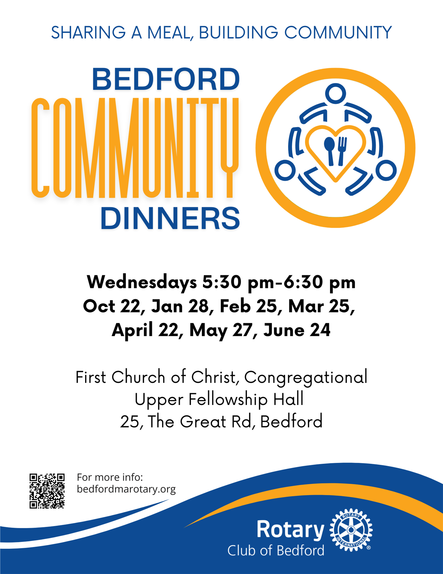 The Bedford Community Dinners are hosted by the Rotary Club of Bedford to bring people together through shared meals. Inspired by the pre-COVID community dinners once hosted by the Bedford Food Pantry, these events are about more than food—they’re about connection, kindness, and belonging.